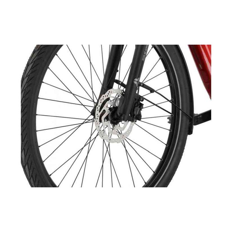 Das Carver Route E.440 rollt auf bewährten 28 Zoll Laufrädern, die den perfekten Kompromiss aus Agilität und Laufruhe bieten. Das große Radmaß sorgt für ein exzellentes Überrollverhalten bei Unebenheiten. Damit der Komfort nicht zu kurz kommt, ist das Bike mit einer hochwertigen Federgabel ausgestattet, die Stöße von Schlaglöchern oder Wurzeln effektiv absorbiert. Die vielseitige Trekking-Bereifung ist sowohl für glatten Asphalt als auch für schottrige Waldwege optimiert, sodass du dich bei der Routenwahl niemals einschränken lassen musst.
