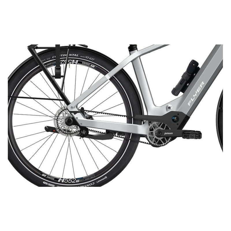 In Kombination mit der Pinion MGU setzt Flyer konsequent auf den Riemenantrieb. Anstelle einer herkömmlichen Kette überträgt ein kohlenstofffaserverstärkter Riemen die Kraft auf das Hinterrad. Die Vorteile sind gewaltig: Der Antrieb benötigt kein Fett oder Öl, was Ihre Hosenbeine sauber hält. Er arbeitet nahezu geräuschlos und hält um ein Vielfaches länger als eine Kette. Da die Schaltung im Motor integriert ist, gibt es kein Schaltwerk am Hinterrad, das verbiegen oder verschmutzen könnte. Das Upstreet TR:CF 7.63 ist damit eines der wartungsärmsten E-Bikes auf dem Markt.