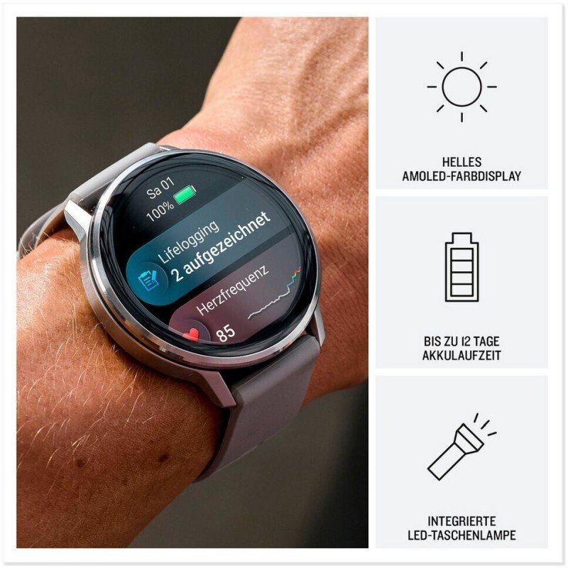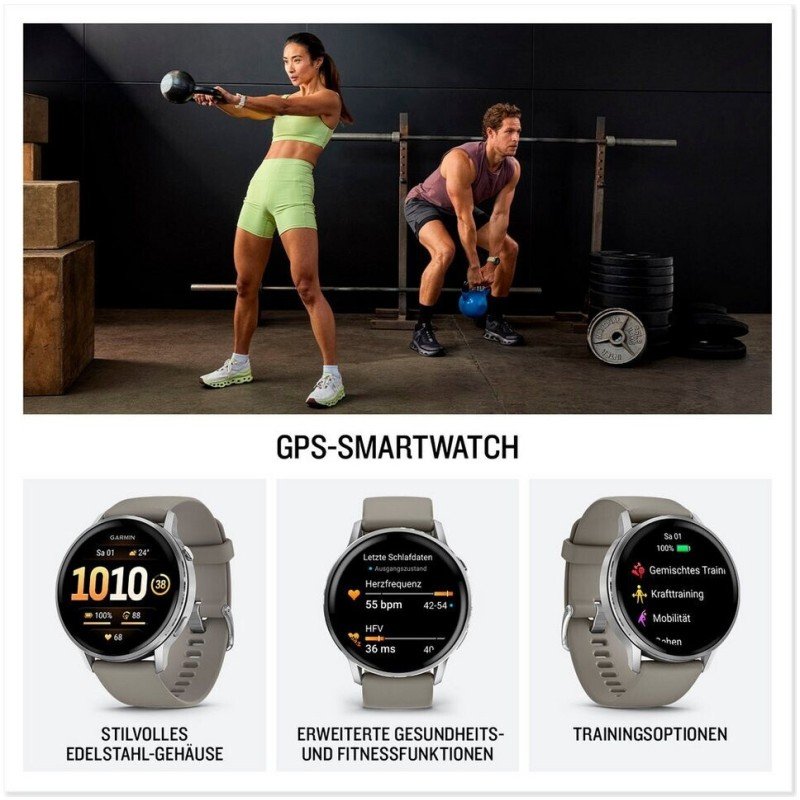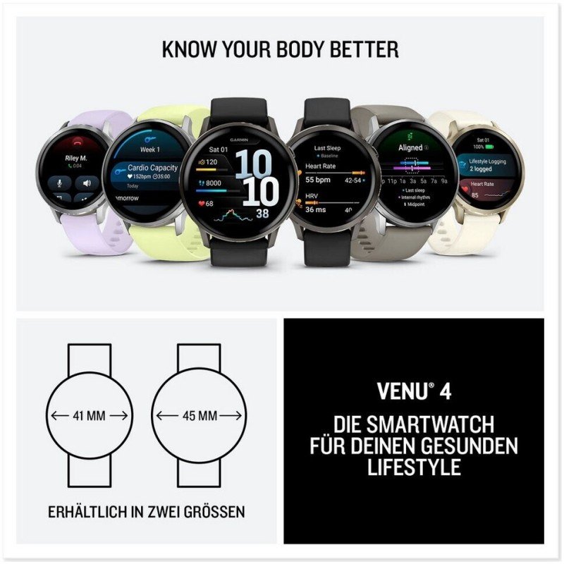 Die Garmin Venu® 4 GPS-Smartwatch vereint Stil und Funktionalität in einem beeindruckenden Design. Mit ihrem 45 mm Edelstahlgehäuse und dem brillanten 1,4-Zoll AMOLED-Display bietet diese Uhr eine klare und lebendige Darstellung all Ihrer Gesundheits- und Fitnessdaten. Die Venu® 4 ist Ihr täglicher Begleiter auf dem Weg zu einem gesünderen Lebensstil, komplett mit einem intelligenten Garmin Coach, der Ihnen basierend auf Ihren Aktivitäts- und Schlafdaten tägliche Trainingsvorschläge unterbreitet. Über 80 Sport-Apps, einschließlich spezifischer Optionen für Rollstuhlfahrende, unterstützen Sie bei Ihrem Fitnessprogramm. Die erweiterte Schlafanalyse passt ihre Schlafenszeit an Ihren individuellen Biorhythmus an und gibt wertvolle Einblicke in Ihren Schlafzyklus. Dank der langen Akkulaufzeit von bis zu 12 Tagen können Sie sich darauf verlassen, dass die Venu® 4 Ihre Fitness- und Gesundheitsdaten zuverlässig erfasst. Genießen Sie zudem die Freiheit, über Bluetooth® Telefonie und Sprachassistenten zu nutzen, während die Uhr auch kontaktlose Zahlungen mit Garmin Pay ermöglicht. Kein Detail wird übersehen, von der integrierten LED-Taschenlampe bis hin zur Wasserdichtigkeit von bis zu 50 Metern.