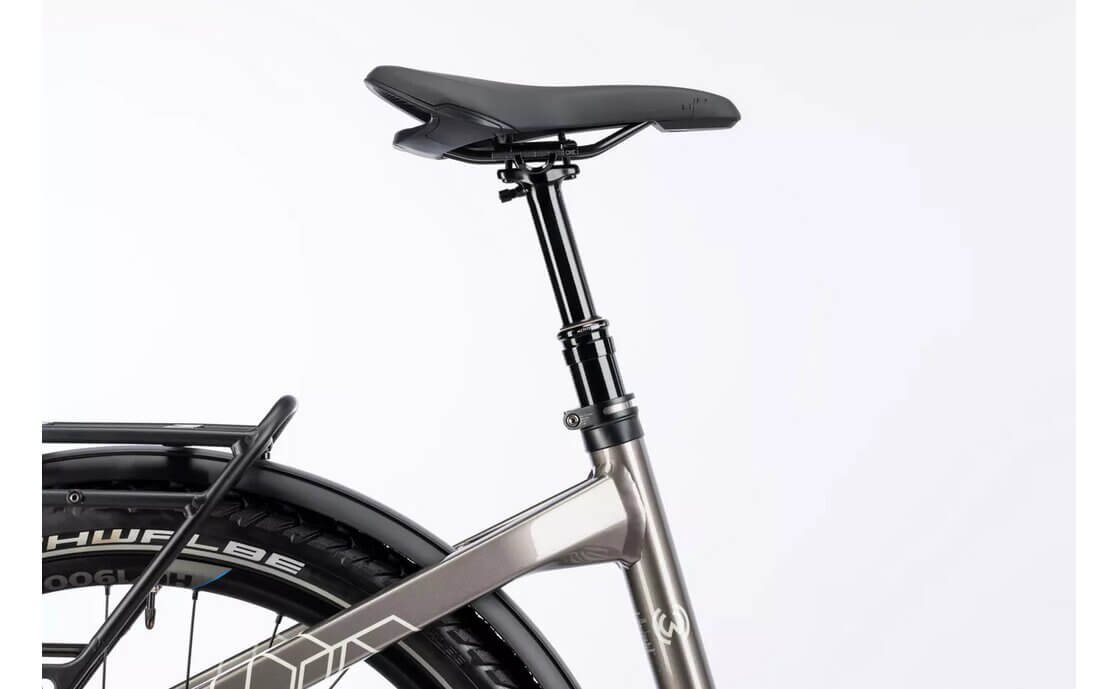 Die Integration des Akkus in das Unterrohr des Tiefeinsteigers ist meisterhaft gelöst. Trotz der hohen Kapazität bleibt das Design schlank und elegant. Der tiefe Schwerpunkt sorgt zudem für ein stabiles und sicheres Fahrgefühl, das besonders bei voller Beladung oder bei Fahrten in unebenem Gelände spürbar wird.